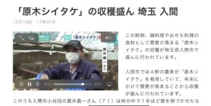 NHK首都圏NEWS 2021年12月15日NEWS全て, メディア掲載/講師・講演 0 入間市広報課のメディアレクチャーがありまして、8社の皆さまがシイタケ栽培の現場を取材に来られました。 早速、放送や紙面をみたよと連絡下さったり、お店に来て下さる方もいて、ありがとうございます。 NHK 首都圏NEWS https://www3.nhk.or.jp/shutoken-news/20211214/1000073776.html テレビ埼玉 読売新聞/埼玉新聞/毎日新聞/朝日新聞 JAいるま野/入間ケーブル Share: