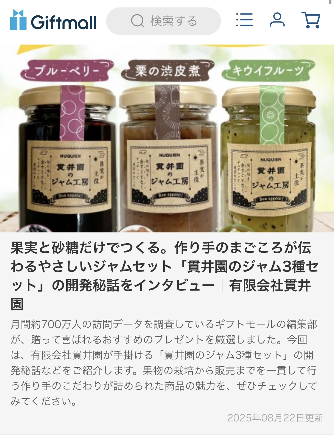 日本最大級のプレゼント専門サイト ギフトモールにて、「貫井園のジャム3種セット」の開発裏話などが掲載されました。 https://giftmall.co.jp/AXo2OI8S 姉妹サイト ベストプレゼントでは、編集部のおすすめ商品として取り上げられています。 https://bestpresent.jp/birthday/guide/AXFD64JT ぜひチェックしてみてください。